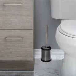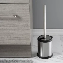 Store your toilet brush in plain sight with the attractive Bath Bliss Toilet Brush Set. This brush and decorative storage container is discreet and will make a lovely accent to most bathroom decors. The handle and canister for the bathroom toilet brush have a slick finish and are constructed from a hygienic and rust-resistant stainless steel. The set also has a durable, rounded, bristle brush that is designed to remain hidden when the product is not in use. This stainless steel toilet brush will keep both your bathroom and toilet looking their best. Treated to resist mildew, bacteria and rust. Comes with an opening and closing lid.