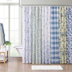 Give your bathroom a refreshing feel with the new Laura Ashley Flora shower curtain. Delicate blue flowers scatter across the Flora shower curtain and concentrate at the hemline. This Laura Ashley floral is fresh and pretty on soft 100% cotton twill. 72″l x 72″w. Machine washable for easy care. Liner and hooks not included.