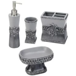 The Avanti Braided Medallion Silver 4-Piece Bath Accessory Set features items decorated with a two-tone color-block design-grey and silver- separated by a faux braid with a medallion on the tumbler and lotion dispenser. Made of durable hand painted resin. Set includes one each of tumbler, toothbrush holder, soap dish and lotion dispenser. Imported.