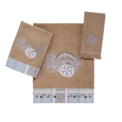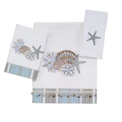 The Avanti By the Sea Mineral 3-Piece Decorative Towel Set features an exquisitely embroidered under-the-sea scene with a variety of shells, starfish and coral in blues and beiges. The bath and hand are finished with a coordinating blue and white stripe cotton fabric trim and the bath is adorned with a trim with real seashells. 100% cotton (exclusive of embellishment) mineral velour towel. Set includes one bath, one hand and one fingertip towel. Embroidered and sewn in the US, imported materials.