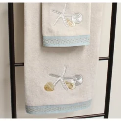 The Avanti Coastal Terrazzo rug is tufted in 100% cotton and embroidered with a nautilus and starfish. The rug has a white center and aqua border top and bottom. Imported.