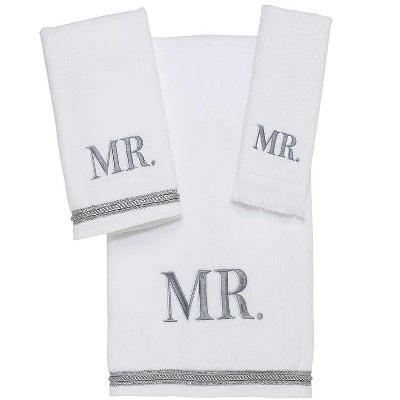 The Avanti Mr. White 3-Piece Decorative Towel Set features “Mr.” embroidered in silver block letters with a silver rope trim on a 100% cotton (exclusive of embellishment) white velour towel. Set includes one each of bath, hand and fingertip towel. Embroidered and sewn in the US, imported materials.