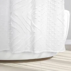 Infuse a feeling of casual sophistication into your bathroom with the Dotted Chevron Shower Curtain by Allure Home Creation. This stylish crisp white curtain features a tufted dotted chevron design creating beautiful texture and dimension. This updated classic style will blend easily with many decors. This embellished shower curtain measures 70″ x 72″ and fits most standard sized tubs and shower areas providing privacy and protection from water splashing onto the floor. Crafted from 100% easy care polyester fabric with tufted embellishments and with a reinforced buttonhole top that works well with standard shower hooks and curtain rods. Use of a liner is recommended. Machine wash cold on gentle cycle and tumble dry on low heat.