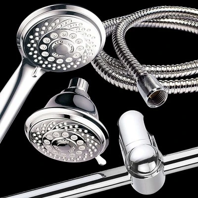 3 Way Rainfall Shower Head/Handheld Combo with Instant-Mount Height and angle adjustable shower system. The overhead showerhead has a great shower and slide bar flexibility from above and features a water-saving option. Each shower features a 4″ chrome face that has a 6-function setting, 5 ft. stainless steel shower hose, and a 3-way water diverter. The angle-adjustable mounting bracket allows water in any direction. Includes plumbers’ tape and Limited Warranty.