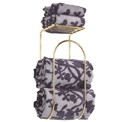 The mDesign Decorative Wall Mount Towel Holder will ensure that towels are always at your fingertips in the bathroom or anywhere in the home. The stylish curves of this holder add a modern look to any bathroom motif, while its open design keeps towels at the ready for you or your guests. Towels of all sizes easily fit into the holder, just roll them to fit; Use the top shelf to neatly stack smaller face or hand towels or use it to display decorative soaps or additional toiletries. The holder easily installs with the included hardware. mDesign – more calm, less clutter