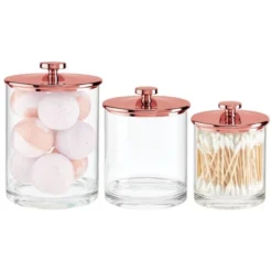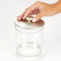 This mDesign Vanity Cosmetic Canister Jar with lid set is great for keeping cosmetics and other daily essentials organized on your bathroom vanity or a dresser top. Use these round jars for everything from cotton balls and cotton swabs to cosmetic wedges and makeup swabs.