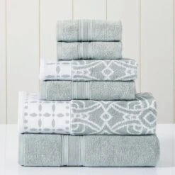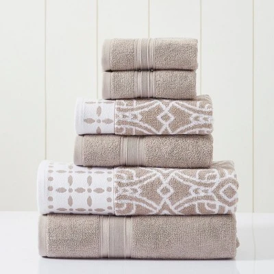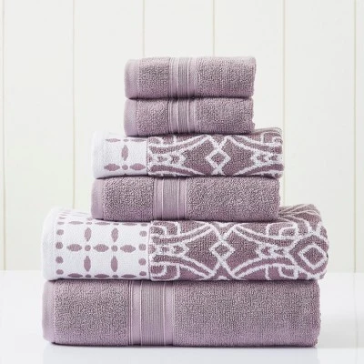 Bring color, style, and elegance to your bathroom decor with this 6-piece towel set. The set features two bath towels, two hand towels, and two wash clothes, crafted from extra soft combed cotton for a cozy, durable, and absorbent design. Half of the set features a solid color pattern, while the other half features a medallion graphic design, allowing you to mix and match the towels to add style and texture to your room. Durable enough for everyday use, or as a pop of fashion to brighten up your bathroom.