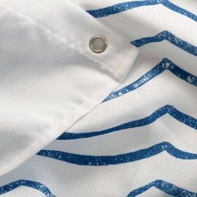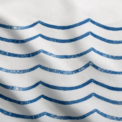 The WAVES fabric shower curtain is the perfect fit for any bathroom decor. This curtain has a somewhat nautical feel. Solid White on the top half of the curtain with a gentle blue wavy print on the bottom portion. This shower curtain is made from 100% Polyester. The waves shower curtain is easy care, Machine Washable and features rust resistant grommets.